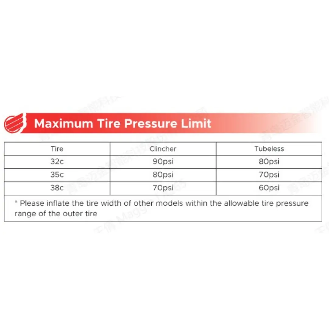| Maximum Tire Pressure | Clincher tire 120psi,Tubeless tire 110psi |